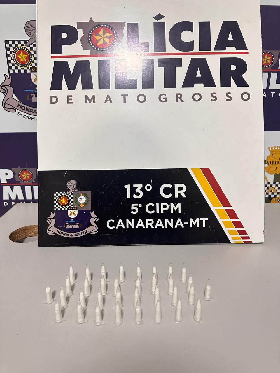 Durante a tentativa de fuga, os suspeitos tentaram se livrar das drogas jogando o material na via pública. Ainda assim, os policiais conseguiram recuperar o pacote, que continha vários pinos preenchidos com substância análoga à cocaína.