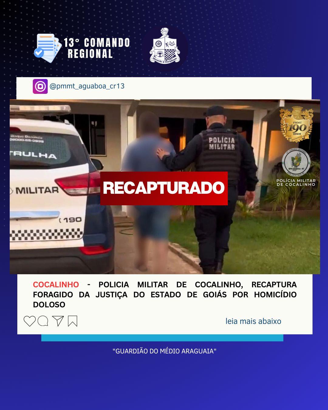 A Polícia Militar de Cocalinho realizou, nesta semana, a recaptura de um homem procurado pela Justiça do Estado de Goiás. A ação foi resultado de um trabalho conjunto entre a Agência Regional de Inteligência do 13º Comando Regional, a Força Integrada de Combate ao Crime Organizado (FICCO-DF) e a equipe local da PM.