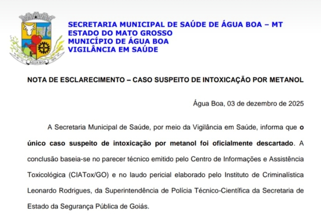 Nesta quarta feira (3), a Vigilância em Saúde da Secretaria Municipal de Saúde de Água Boa divulgou uma nota de esclarecimento a respeito de um caso suspeito de intoxicação por metanol recentemente no município.