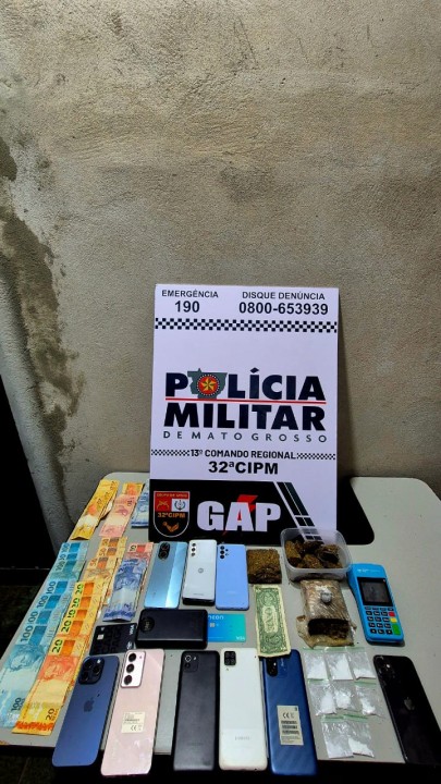 No local foram apreendidos drogas, grande quantia em dinheiro, vários celulares e maquininha de cartão. Um dos suspeitos no local inclusive faz uso de tornozeleira eletrônica e esteve preso pelo crime há pouco tempo.