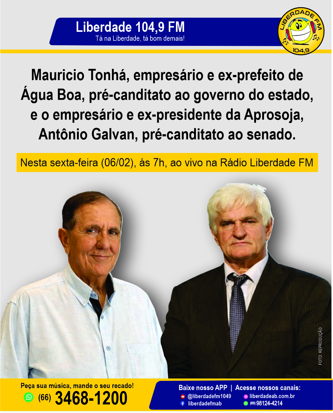 A rádio Liberdade FM promove nesta sexta-feira (7) uma entrevista especial com dois importantes nomes do cenário empresarial e político de Mato Grosso. O empresário e presidente da Estância Bahia Leilões, Maurício Cardoso Tonha, pré-candidato ao Governo do Estado, e Antônio Galvão, ex-presidente da Aprosoja e também empresário, serão os convidados do programa matinal da emissora.