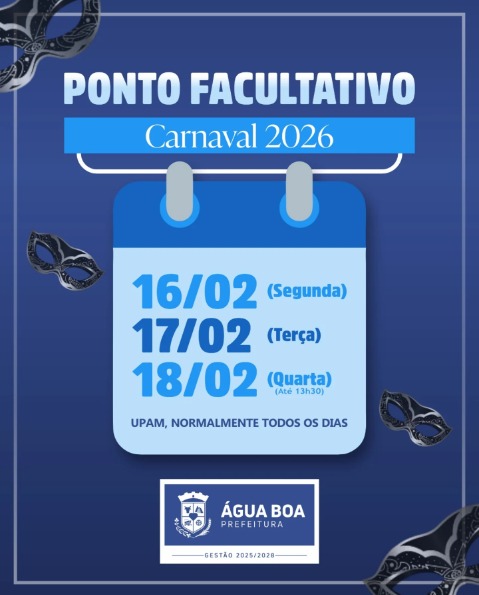 A Prefeitura de Água Boa informou que, em razão do Carnaval, será decretado ponto facultativo na próxima segunda e terça-feira. Durante esses dias, não haverá atendimento ao público nos órgãos municipais.