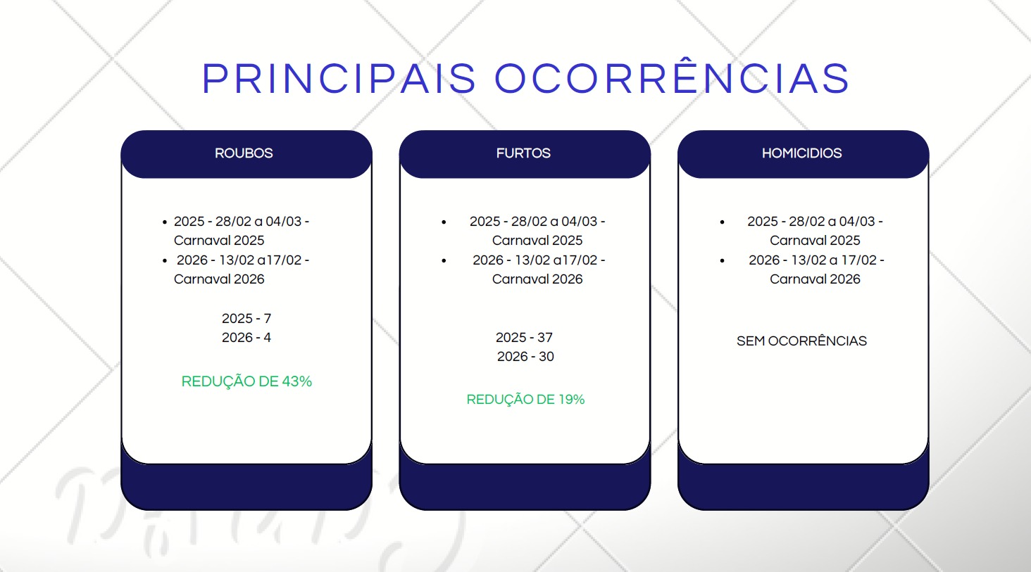 De acordo com os dados apresentados, houve redução de 43% nos casos de roubo em comparação com o Carnaval de 2025, caindo de 7 para 4 ocorrências. Os furtos também apresentaram queda de 19%, passando de 37 registros no ano anterior para 30 em 2026. Um dos destaques do relatório é a ausência de homicídios durante o período da operação.