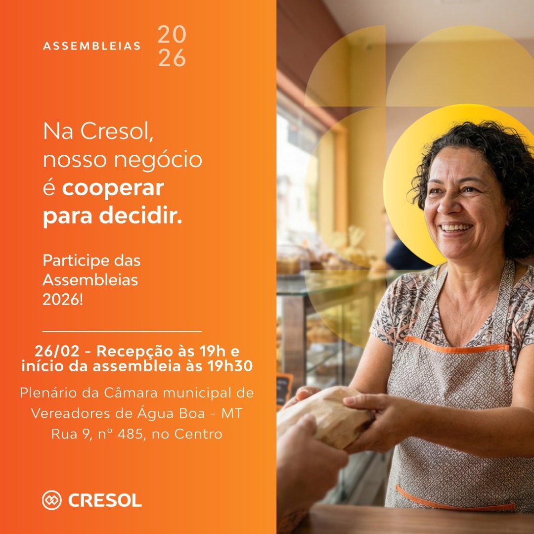 Além da expansão no município, a Cresol também convida todos os cooperados para participarem da Assembleia 2026, momento importante de transparência e decisão coletiva. O encontro será realizado no dia 26 de fevereiro, com recepção às 19h e início da assembleia às 19h30, no Plenário da Câmara Municipal de Vereadores de Água Boa – MT, localizado na Rua 9, nº 485, Centro.