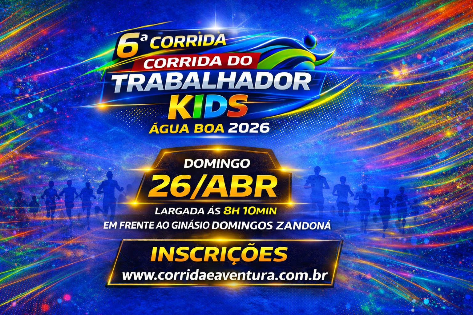 A Prefeitura de Água Boa abriu as inscrições para a 6ª Corrida do Trabalhador Kids 2026, evento esportivo voltado para crianças e adolescentes do município. A corrida será realizada no dia 26 de abril (domingo), na Avenida Planalto, com início previsto para 8h10 da manhã.