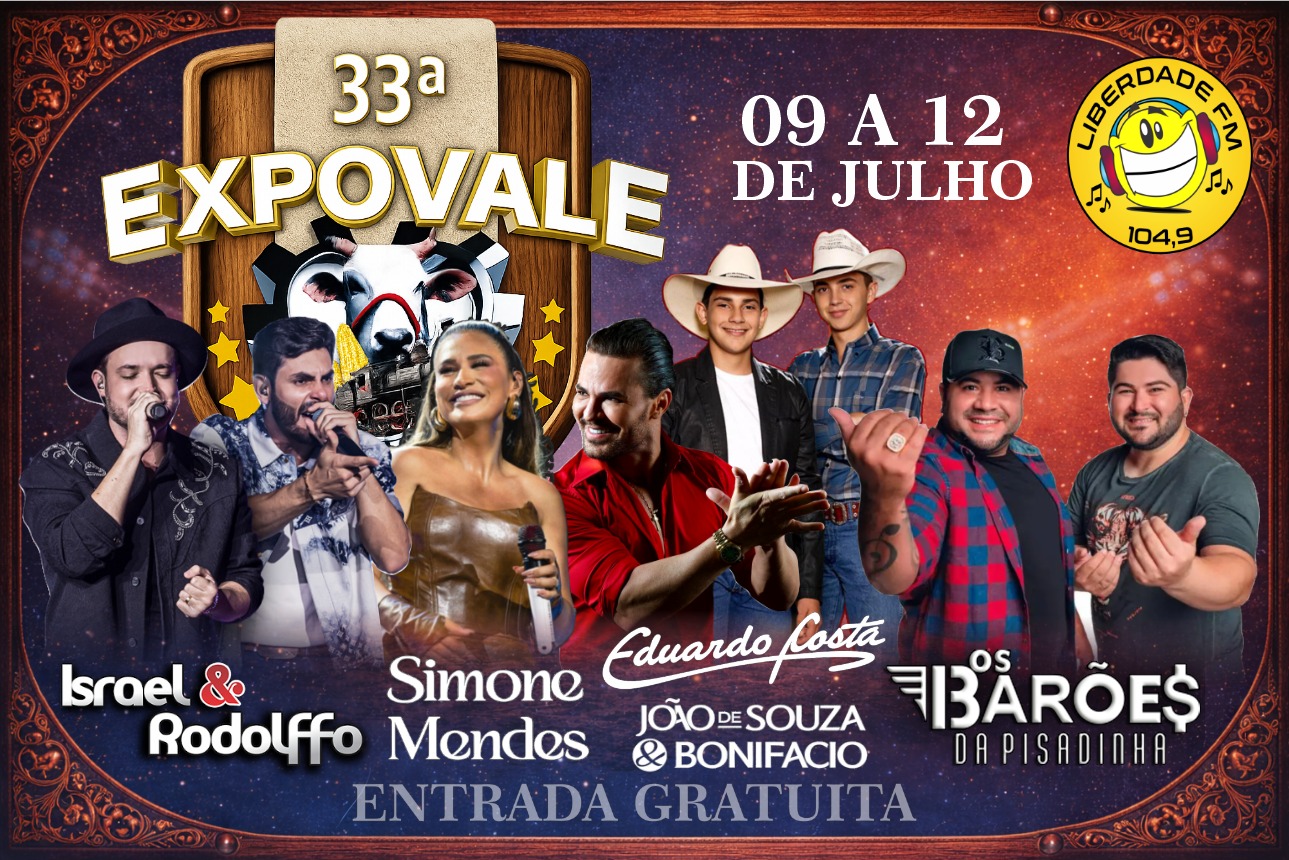 A comissão organizadora da 33ª Expovale anunciou oficialmente, na noite desta sexta-feira (13), a programação de shows da edição de 2026 da tradicional exposição agropecuária de Água Boa, no Mato Grosso. O evento está marcado para acontecer entre os dias 9 e 12 de julho e terá entrada gratuita para o público, reunindo atrações musicais de destaque no cenário nacional, além de rodeio e outras atividades que fazem parte da tradição da feira.