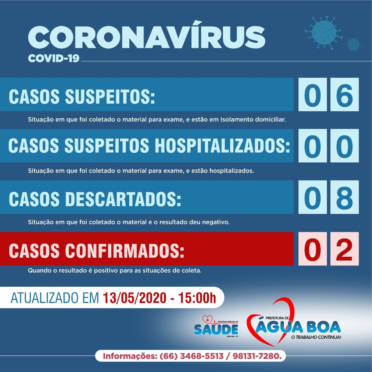 A situação epidemiológica em Água Boa constavam seis pessoas com suspeita da Covid 19, aguardando o resultado do Laboratório Central de Mato Grosso (Lacen) localizado em Cuiabá. Até neste dia 12/05 havia apenas um caso confirmado no município, sendo 07 casos suspeitos, 01 caso hospitalizado e 07 casos descartados.