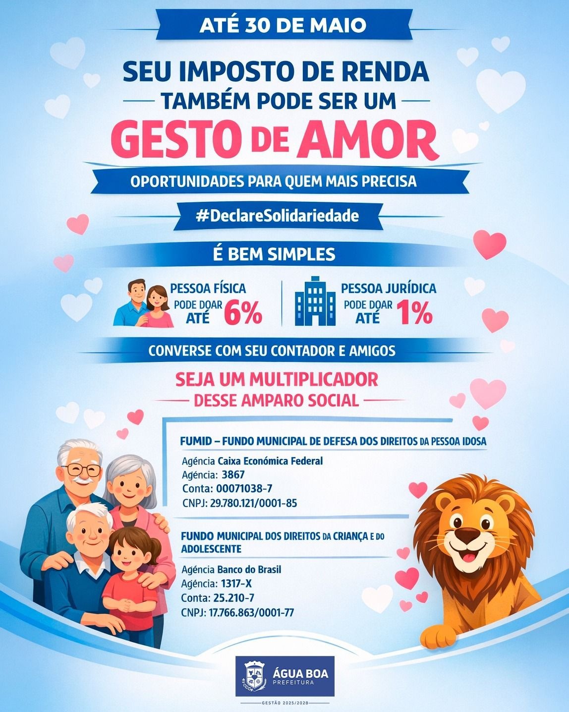 Até o dia 30 de maio, contribuintes de todo o país têm a oportunidade de dar um novo significado ao pagamento do Imposto de Renda. Por meio da declaração, é possível destinar parte do valor devido para fundos municipais que apoiam diretamente projetos sociais em Água Boa, beneficiando crianças, adolescentes e idosos.