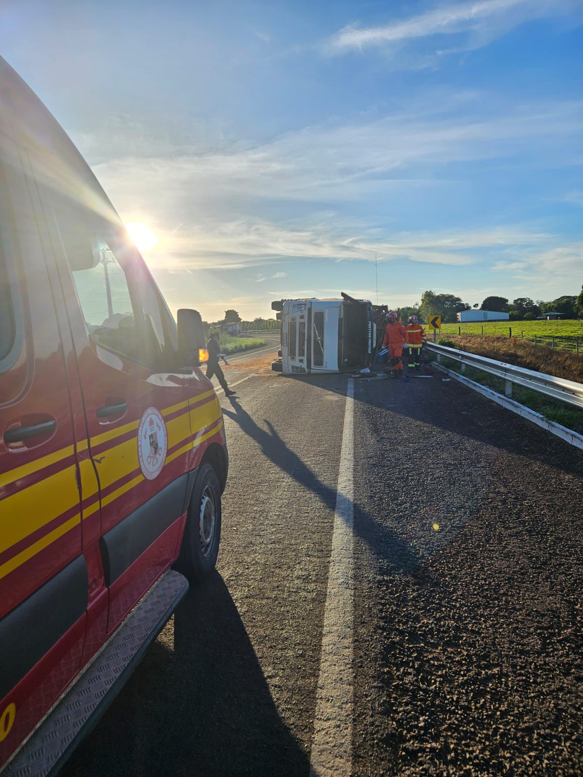 Acidente ocorreu na manhã de terça-feira (8) e deixou carga espalhada na pista; motorista foi socorrido antes da chegada da equipe