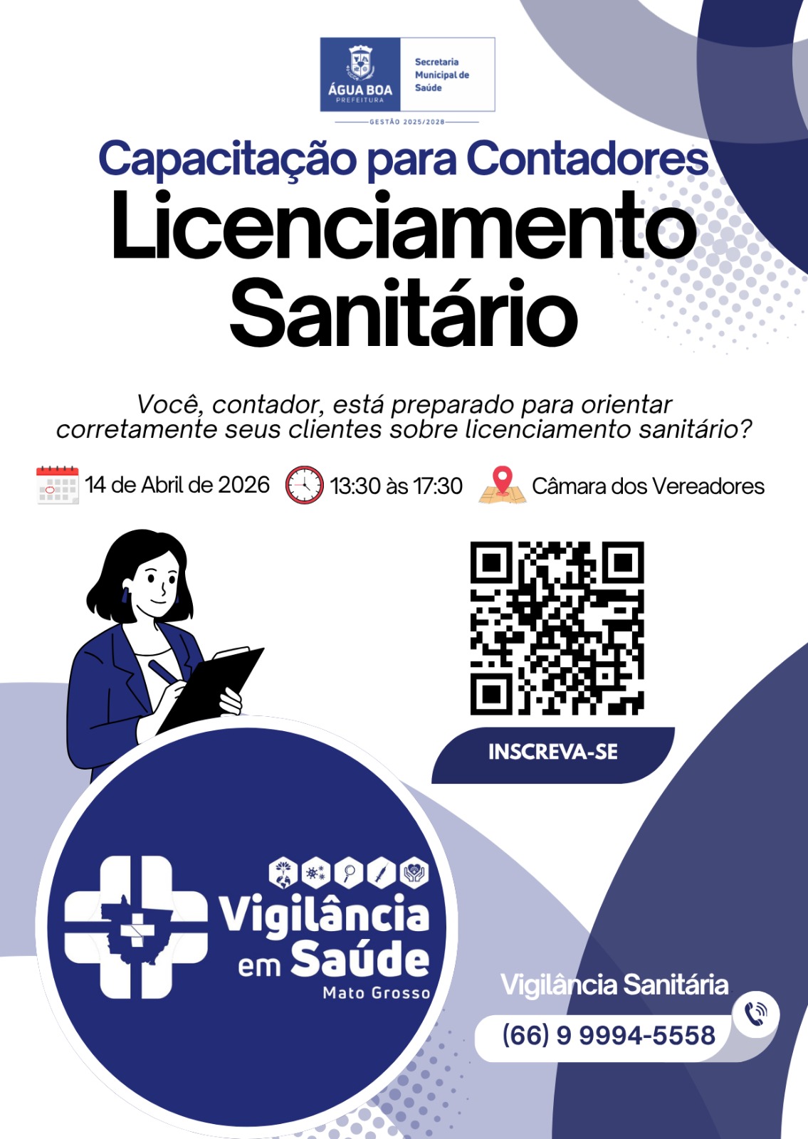 Contadores terão a oportunidade de aprimorar conhecimentos sobre o licenciamento sanitário durante uma capacitação promovida pela Vigilância Sanitária nesta terça-feira, 14 de abril, das 13h30 às 17h30, na Câmara dos Vereadores.