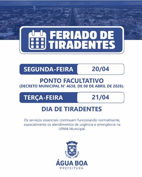 A Prefeitura de Água Boa informou que a próxima segunda-feira, dia 20 de abril, será ponto facultativo no município, conforme o Decreto nº 4.638, publicado no dia 8 de abril de 2026. A medida suspende o funcionamento das repartições públicas municipais, com exceção dos serviços considerados essenciais.