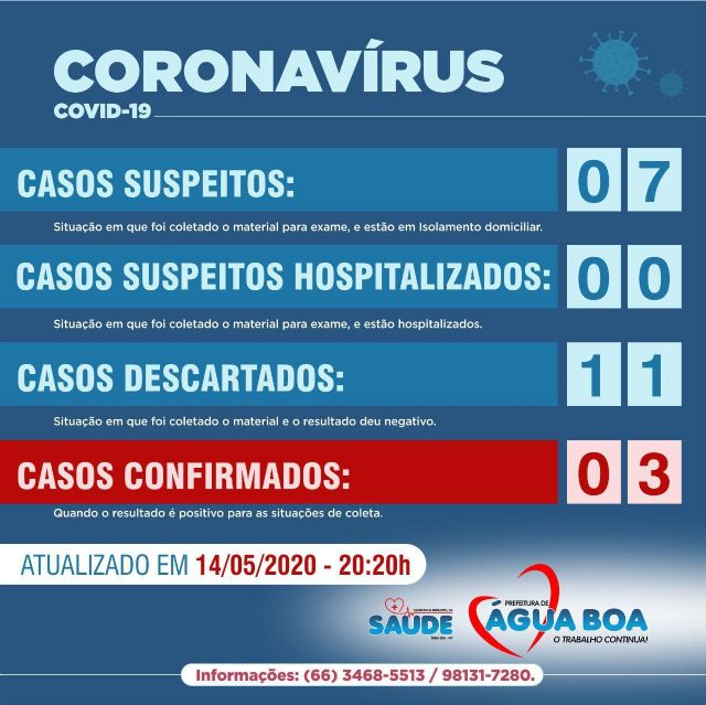 Foi confirmado no início da noite desta quinta-feira (14) o terceiro caso de coronavírus em Água Boa. Há ainda há mais 7 casos suspeitos; 11 descartados e nenhum hospitalizado.