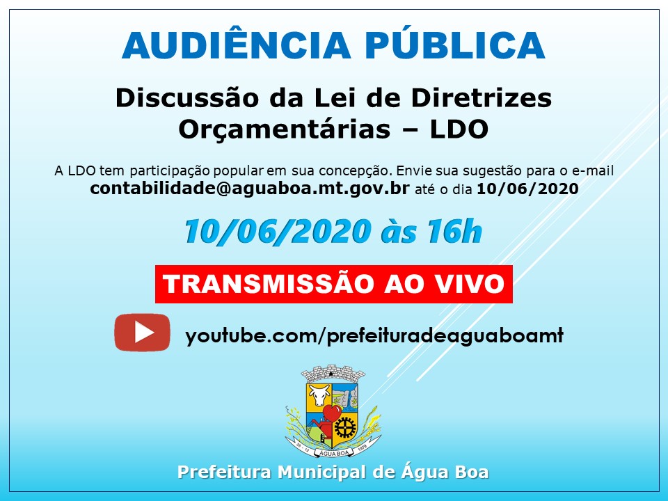 A Prefeitura Municipal de Água Boa, por meio da Secretaria de Municipal de Planejamento e Finanças, vai realizar a audiência pública para elaboração da Lei de Diretrizes Orçamentária (LDO) para o exercício 2021, exclusivamente pela internet. A audiência online acontecerá no dia 10/06/2020 a partir das 16 horas.