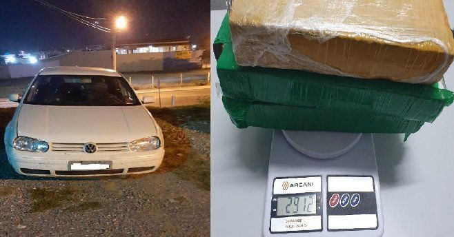 A equipe da Força Tática parou os suspeitos quando passavam pela rotatória da Avenida das Torres, em um veículo VW Golf branco. A droga foi encontrada debaixo do banco do passageiro.