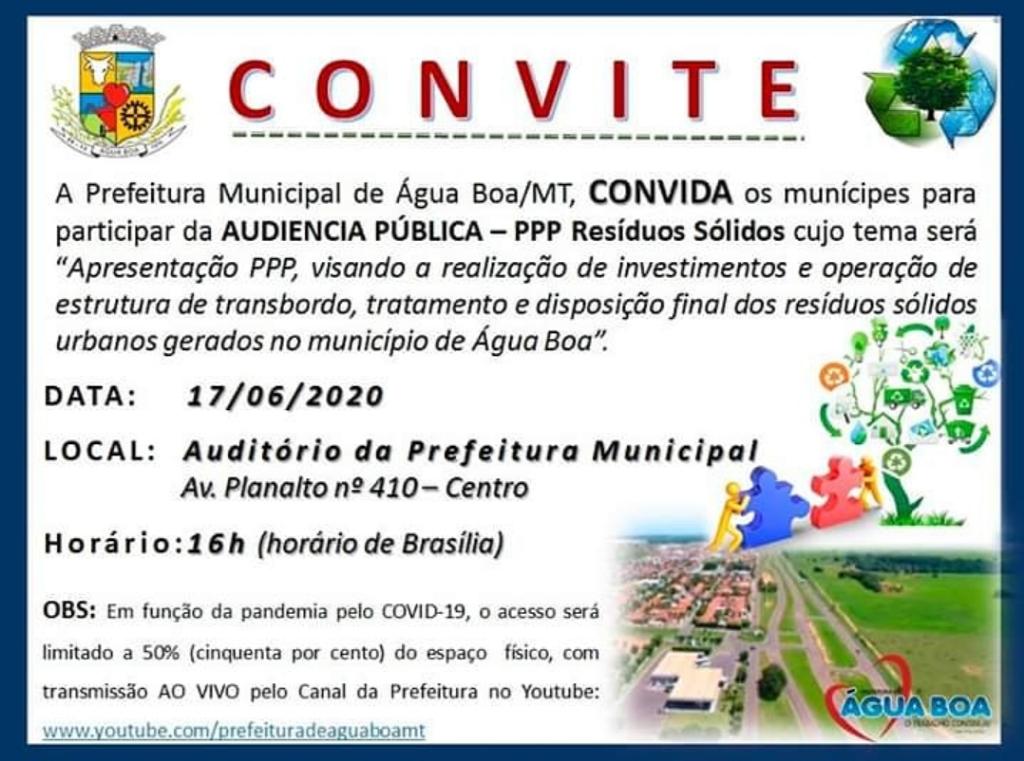Em virtude da Pandemia COVID-19, será aberta à participação de qualquer munícipe, com acesso de no máximo de 50% (cinquenta por cento) do espaço físico, com transmissão AO VIVO pelo Canal da Prefeitura no Youtube: www.youtube.com/prefeituradeaguaboamt