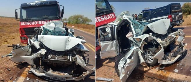 Um caminhão guincho de resgate e um Toyota Etios com placas de Brasília/DF se chocaram na BR-158. No carro havia três pessoas, sendo dois homens na frente e uma mulher no banco de trás.