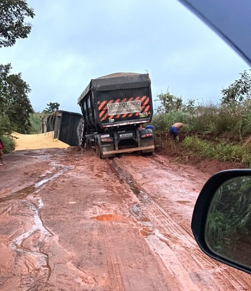 Carreta carregada tomba entre Gaúcha do Norte e Canarana e interdita estrada