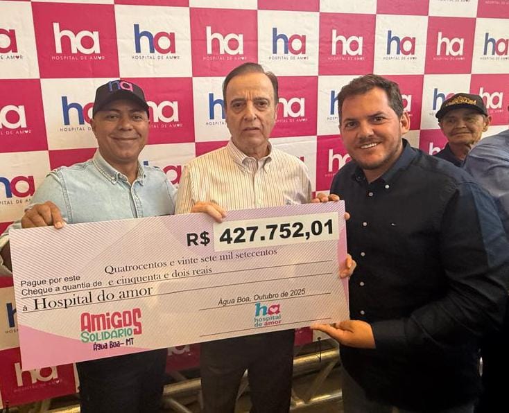 Membros da Comissão do Leilão Direito de Viver de Água Boa Celso Blemer e Ronaldo Portela, realizaram no último sábado (25),a entrega simbólica do cheque no valor de R$ 427.752,01 ao Hospital do Amor de Barretos.