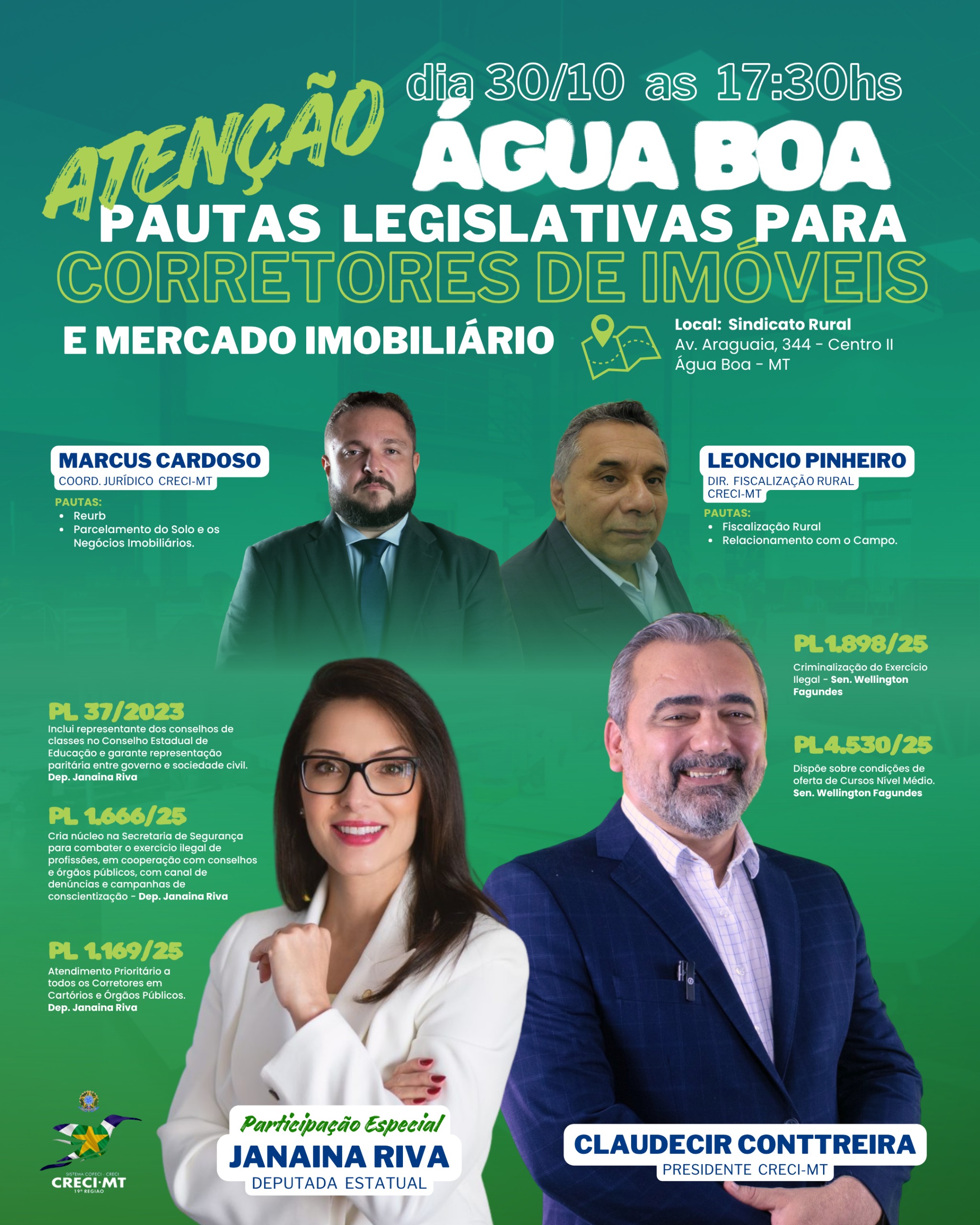 Entre os participantes confirmados estão a deputada estadual Janaína Riva, o coordenador jurídico do CRECI-MT Marcus Cardoso, o diretor de fiscalização rural Leôncio Pinheiro e o presidente da entidade, Claudecir Contreira.