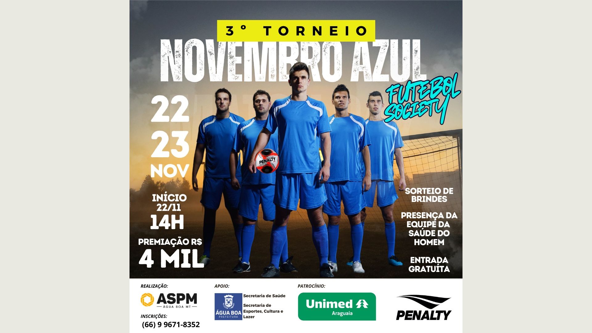 A Prefeitura de Água Boa convida todos os homens do município a participarem do 3º Torneio Novembro Azul de Futebol Society da ASPM, uma iniciativa que une esporte, prevenção e conscientização sobre o câncer de próstata. O evento acontecerá nos dias 22 e 23 de novembro, na Associação dos Servidores Públicos Municipais (ASPM), com início às 14h e premiação total de R$ 4 mil.