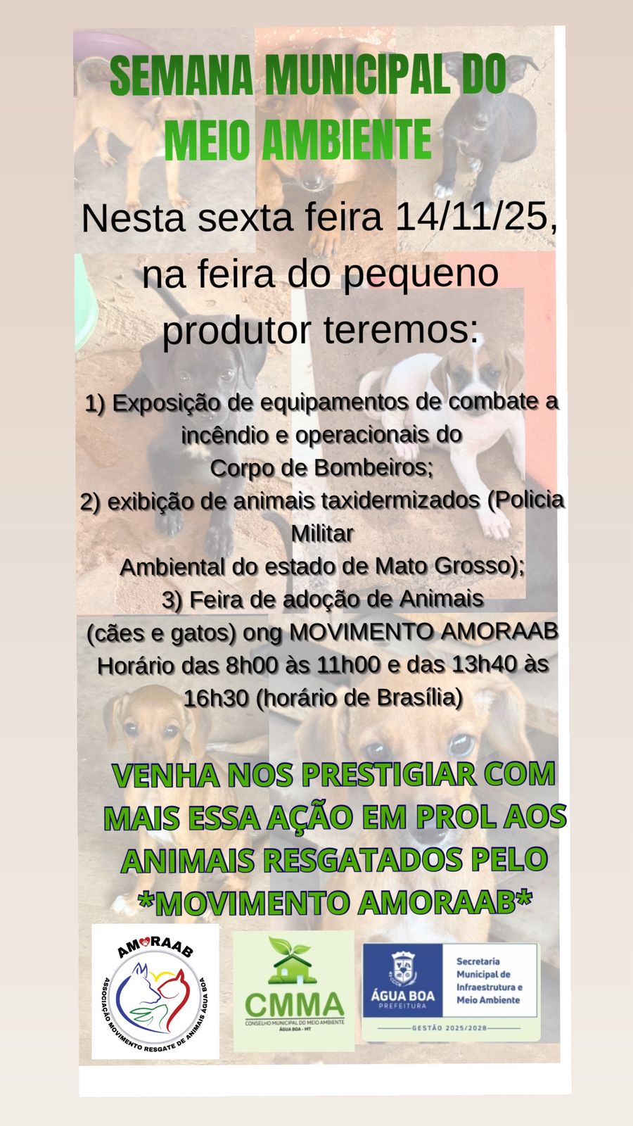 A programação da 1ª Semana Municipal do Meio Ambiente de Água Boa continua com mais uma ação especial voltada à conscientização e ao cuidado com os animais. Hoje, sexta-feira (14/11), a Feira do Pequeno Produtor será palco de um evento que une educação ambiental, solidariedade e amor pelos pets.