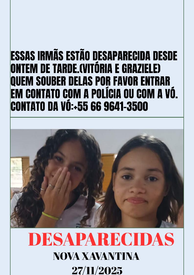 Duas irmãs, identificadas como Vitória e Graziele, estão desaparecidas desde a tarde de ontem (26/11), no município de Nova Xavantina. A família está em busca de informações que possam ajudar a localizar as adolescentes.
