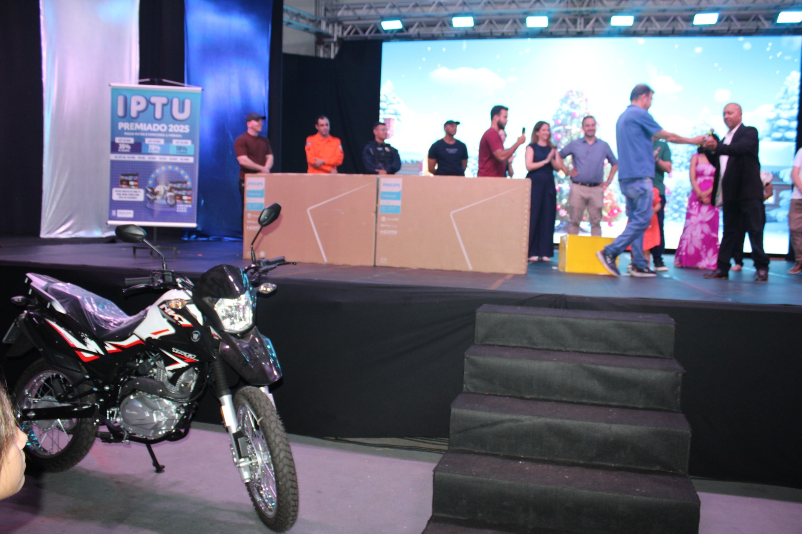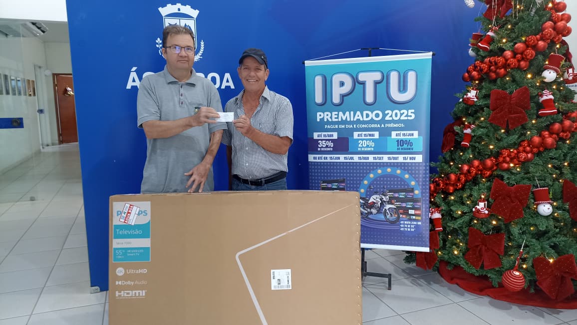 Na ocasião, foram sorteados prêmios entre os contribuintes que mantiveram o IPTU em dia. O 1º colocado foi contemplado com uma moto 0 km, enquanto o 2º e o 3º lugares receberam televisores de 55 polegadas.