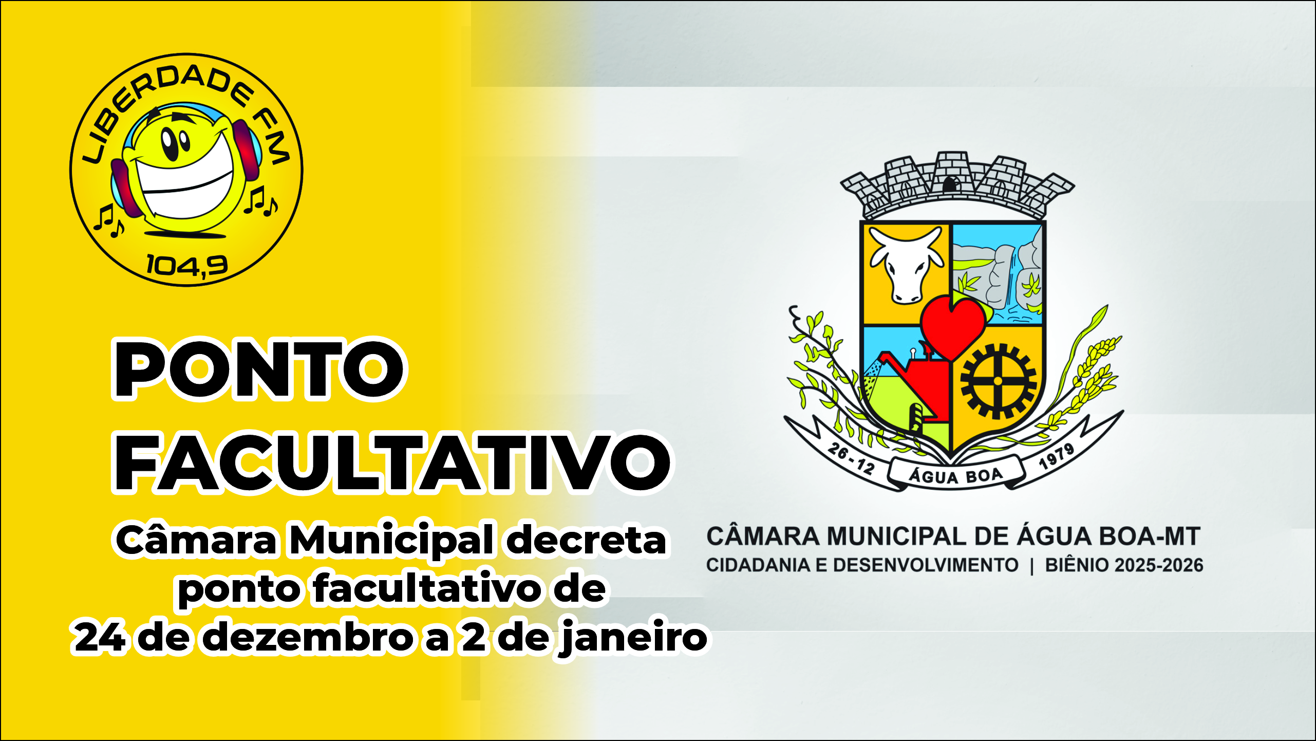 A Câmara Municipal de Água Boa publicou a Portaria nº 040/2025, que declara ponto facultativo no âmbito da Casa entre os dias 24 de dezembro de 2025 (quarta-feira) e 2 de janeiro de 2026 (sexta-feira). O expediente será retomado normalmente em 5 de janeiro de 2026 (segunda-feira).