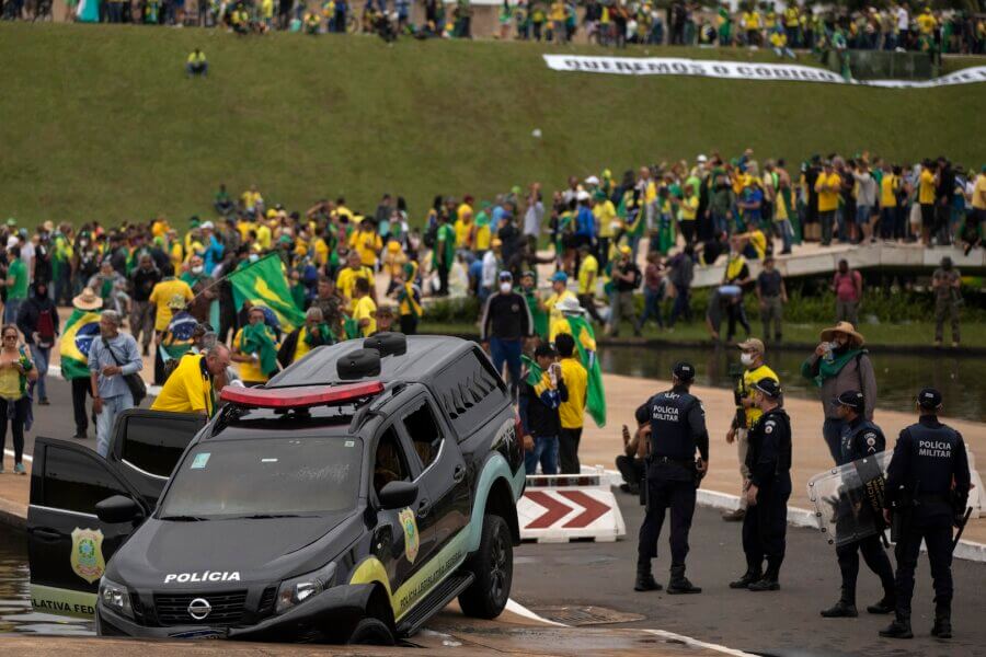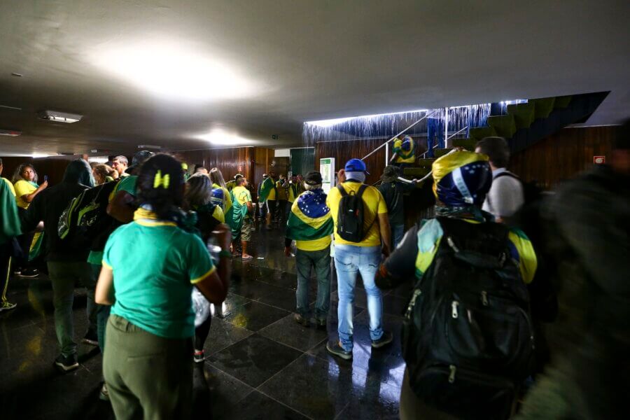 Naquele domingo, manifestantes vindos de diversas regiões do Brasil invadiram e vandalizaram o Congresso Nacional, o Palácio do Planalto e o Supremo Tribunal Federal (STF). Obras de arte, móveis históricos e estruturas dos prédios públicos foram destruídos. O STF foi o edifício mais atingido. No dia seguinte, a então presidente da Corte, ministra Rosa Weber, conduziu uma visita institucional ao local e afirmou que caberia ao tribunal punir todos os responsáveis, em um gesto simbólico de defesa da democracia.