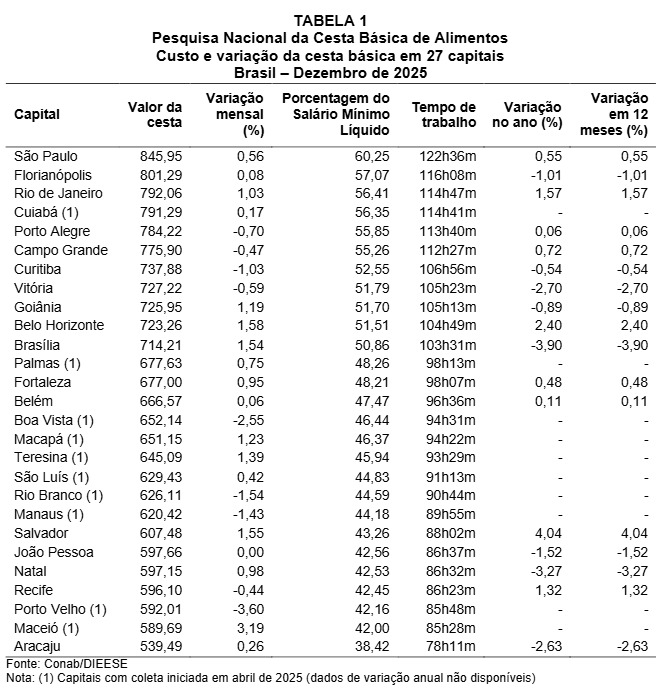 De acordo com a Pesquisa Nacional da Cesta Básica de Alimentos, divulgada pelo Dieese, o preço da cesta aumentou em 17 capitais brasileiras em dezembro de 2025. Cuiabá aparece entre as cidades com as cestas mais caras do país, com custo médio de R$ 791,29, ficando atrás apenas de São Paulo, Florianópolis e Rio de Janeiro.