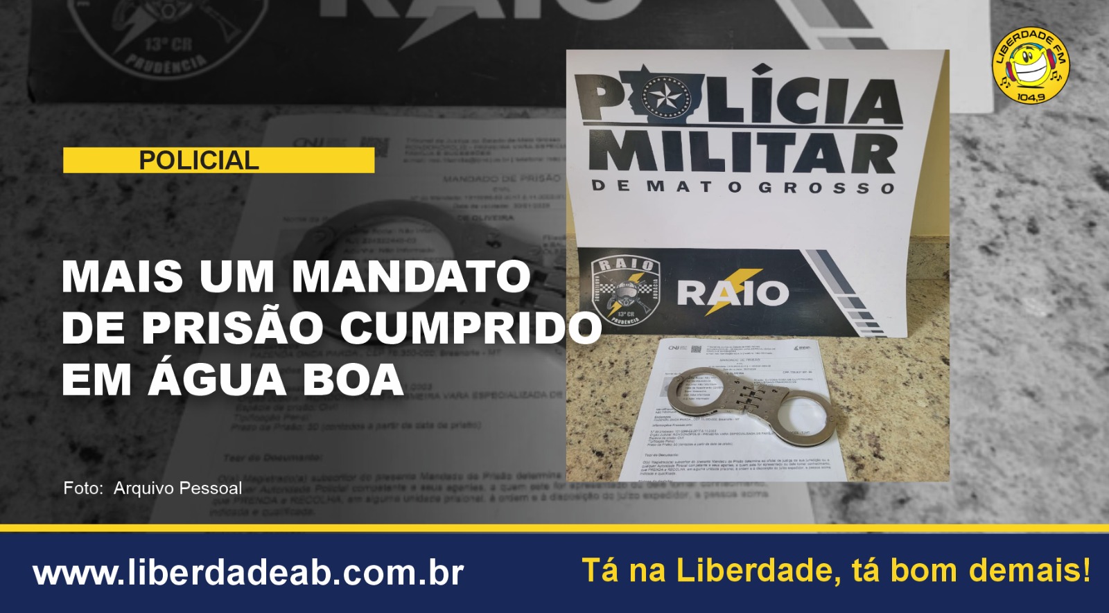 A Polícia Militar de Mato Grosso cumpriu um mandado de prisão na manhã desta terça-feira (13), por volta das 10h30, no município de Água Boa. A ação foi realizada pela equipe do RAIO, vinculada ao 13º Comando Regional, com apoio da Agência Regional de Inteligência.