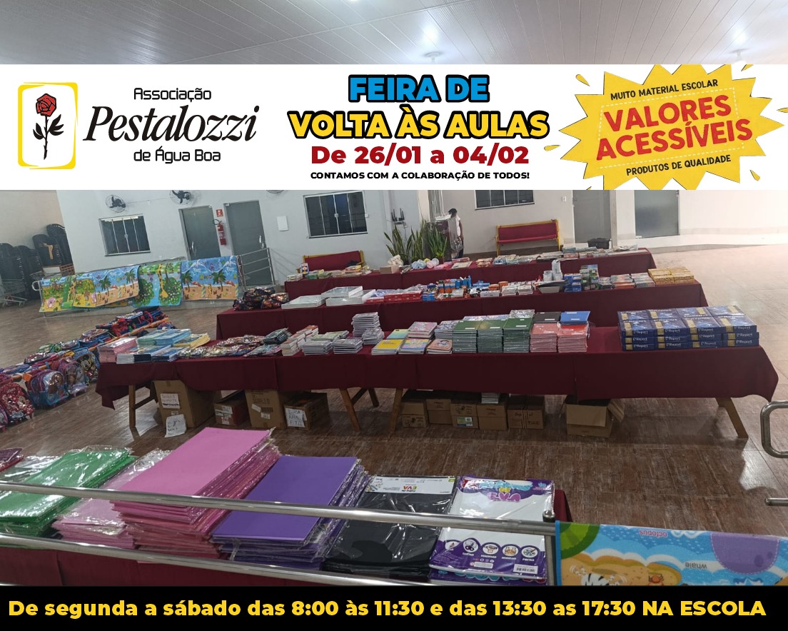A feira acontece no período de 26 de janeiro a 4 de fevereiro, na sede da Pestalozzi, e conta com uma grande variedade de itens essenciais para a rotina escolar, como cadernos, lápis, canetas, mochilas, estojos e outros materiais indispensáveis para estudantes de todas as idades.