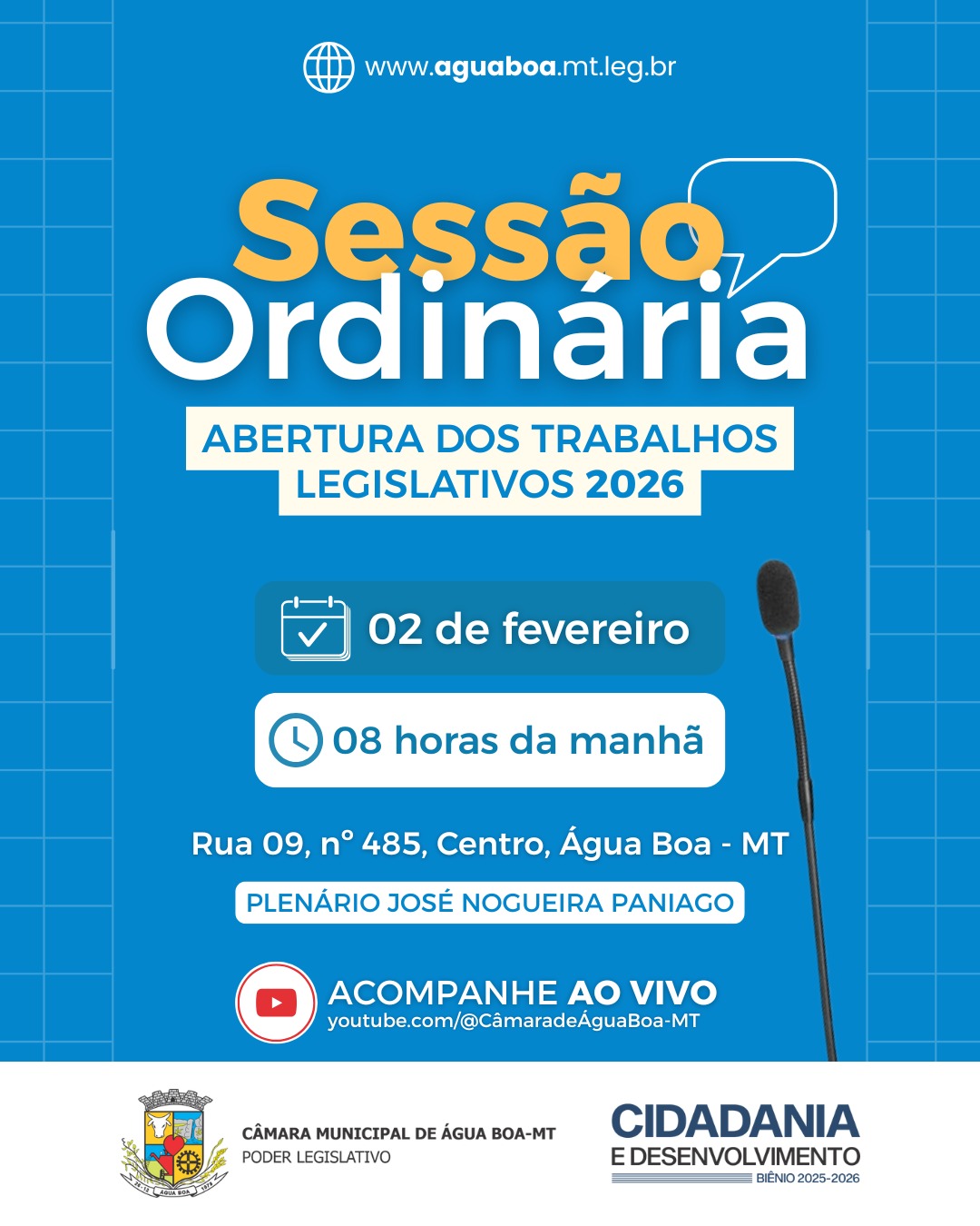 A Câmara Municipal de Água Boa convida toda a comunidade para acompanhar a 1ª Sessão Ordinária de 2026, que marca a Abertura dos Trabalhos Legislativos deste ano, que será realizada na próxima segunda-feira, dia 02 de fevereiro, a partir das 08 horas da manhã. Este momento é fundamental para a transparência e o fortalecimento da democracia em nosso município.