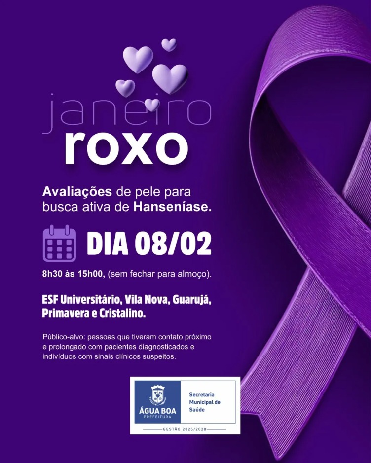 A Prefeitura de Água Boa, por meio da Secretaria Municipal de Saúde, realizou no último domingo (08) uma grande ação de Avaliação de Pele para Busca Ativa de Hanseníase. A iniciativa integrou a Campanha Janeiro Roxo e teve como objetivo ampliar o acesso da população ao diagnóstico precoce da doença.