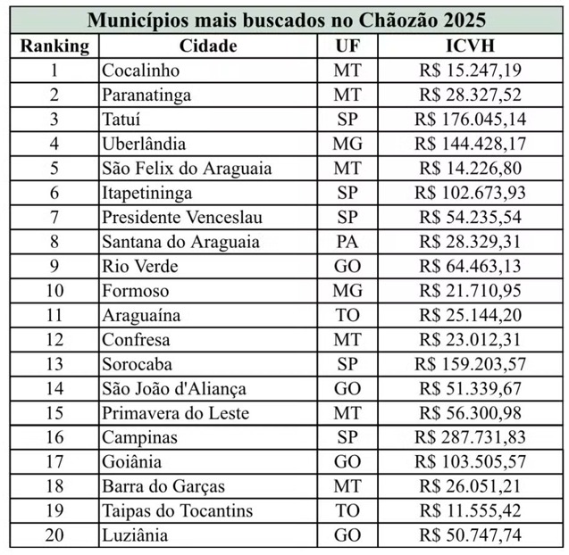 Entre os destaques está Cocalinho (MT), que lidera o ranking nacional de procura por propriedades rurais, com valor médio de R$ 15.247,19 por hectare, conforme o Índice Chãozão Valor do Hectare (ICVH). Logo abaixo, em segundo lugar se encontra Paranatinga (MT), dentre as cidades de MT também aparecem na lista Confresa, São Félix do Araguaia, Barra do Garças e Primavera do Leste, reforçando o protagonismo da região no cenário do agronegócio.