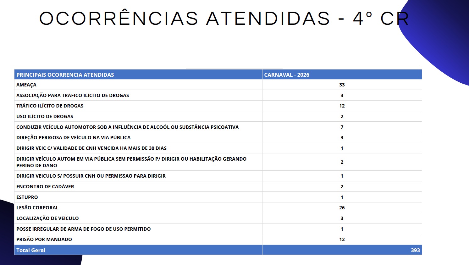 No total, foram contabilizadas 393 ocorrências atendidas pelas equipes do 4º CR. Entre os principais registros estão 33 casos de ameaça, 26 de lesão corporal, 12 prisões por mandado, 12 ocorrências de tráfico ilícito de drogas e 7 casos de condução de veículo sob influência de álcool ou substância psicoativa.