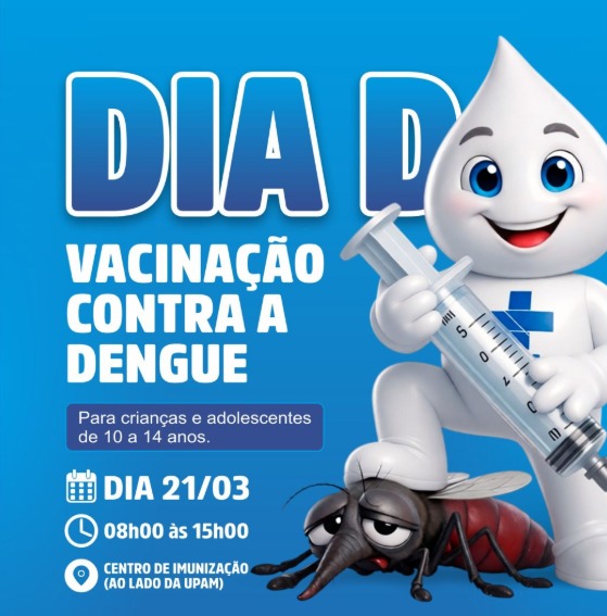 A Prefeitura de Água Boa, por meio da Secretaria Municipal de Saúde, realizará no próximo sábado (21) o Dia D de Vacinação contra a Dengue, voltado para crianças e adolescentes de 10 a 14 anos. A mobilização acontecerá das 8h às 15h, no Centro Municipal de Imunização, localizado ao lado da Unidade de Pronto Atendimento Municipal (UPAM).