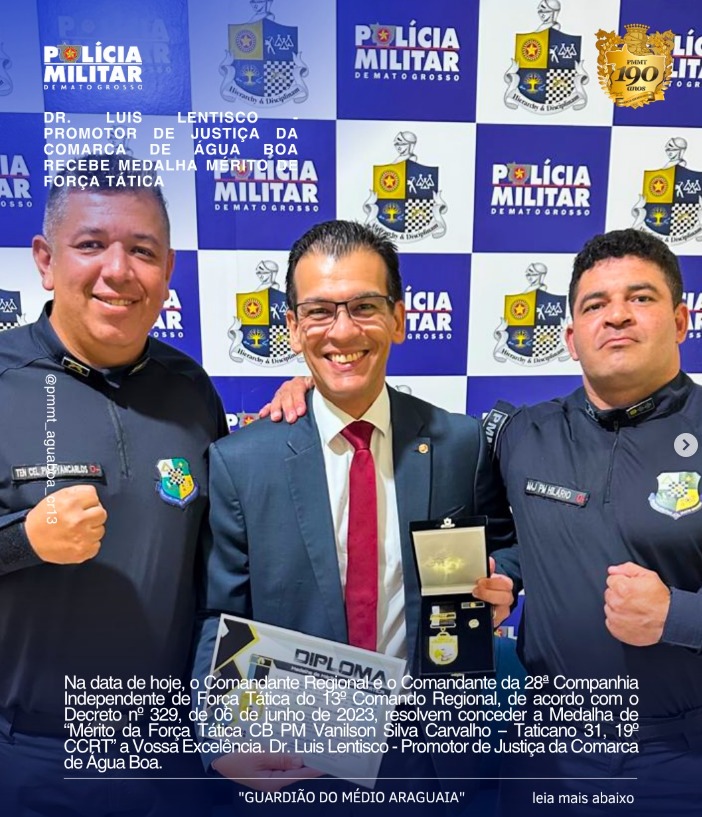 A Polícia Militar do Estado de Mato Grosso, por meio da 28ª Companhia Independente de Força Tática do 13º Comando Regional, concedeu a Medalha de “Mérito da Força Tática CB PM Vanilson Silva Carvalho – Taticano 31, 19º CCRT” ao promotor de Justiça da Comarca de Água Boa, Dr. Luis Alexandre Lentisco.