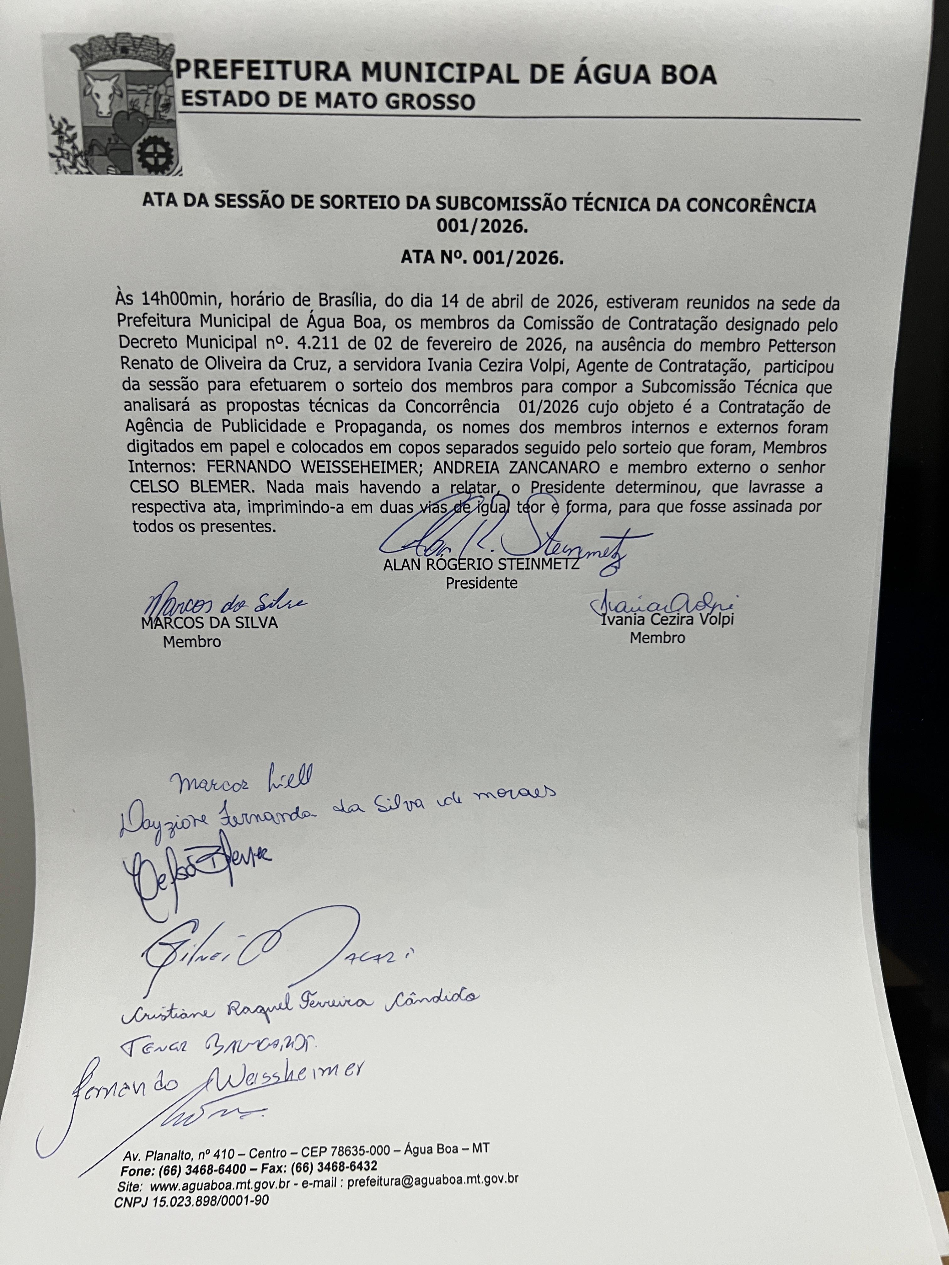 Na tarde desta terça-feira (14), a Prefeitura Municipal de Água Boa realizou o sorteio que definiu os integrantes da Subcomissão Técnica responsável por analisar as propostas da licitação para contratação de uma agência de publicidade e propaganda.