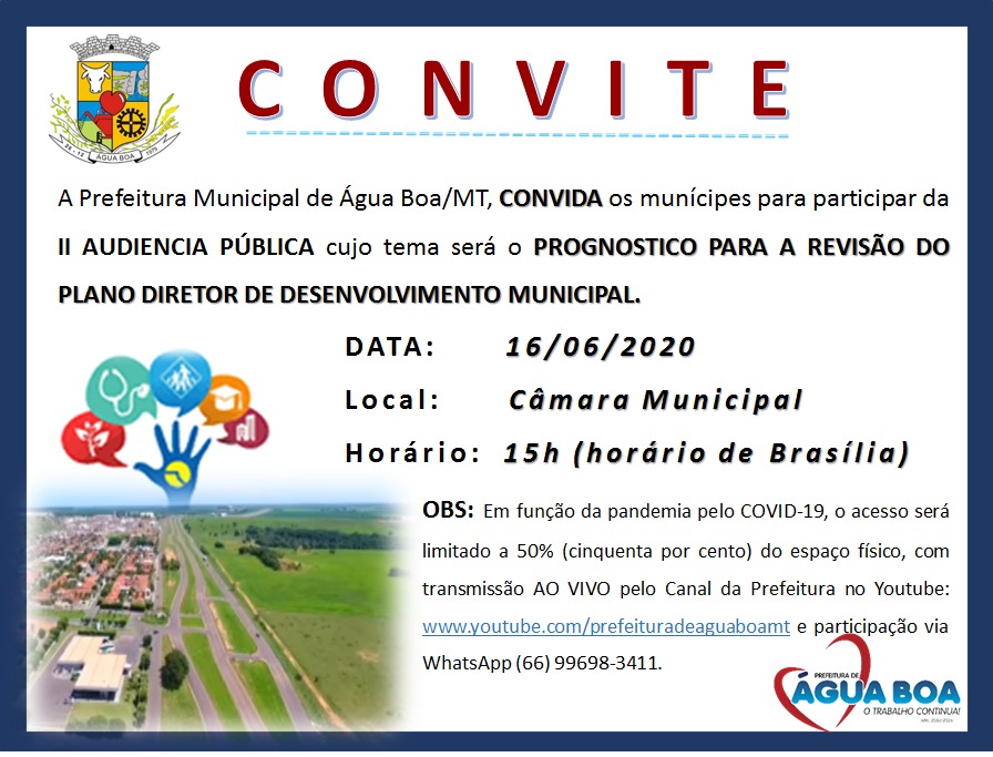 A Prefeitura Municipal de Água Boa, CONVOCA a população em geral, bem como as associações representativas interessadas e demais segmentos da comunidade, para a 2° AUDIÊNCIA PÚBLICA cujo tema será o ( Prognostico para a Revisão do Plano Diretor de Desenvolvimento Municipal ), a ser realizada nesta terça-feira dia 16 de junho de 2020, às 15h no Auditória da Câmara Municipal de Água Boa, objetivando a divulgação e o debate das propostas do Plano Diretor Municipal.