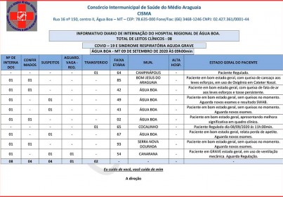 O Consórcio Intermunicipal de Saúde do Médio Araguaia divulgou na manhã de hoje o numero de pacientes internados na ala Covid-19 no Hospital Regional.